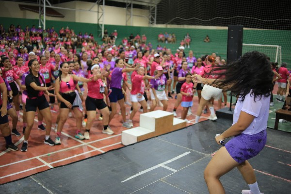 Antes do início da corrida, às 17h, as participantes participaram de um momento de aquecimento conduzido pela profissional Janaina Lima, preparando o grupo para a atividade esportiva.