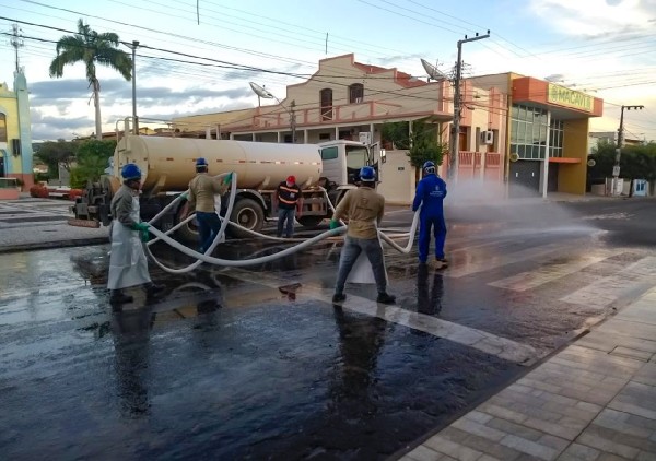 A lavagem desses locais foi feita com uma mistura de água é cloro, com utilização de um carro-pipa.